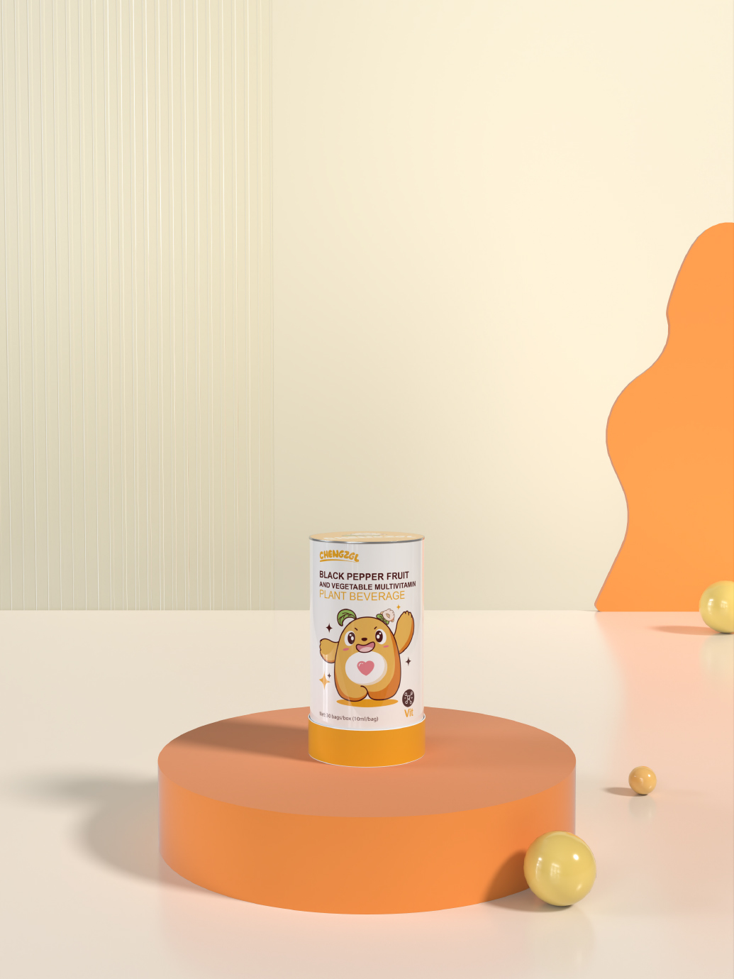 兒童營養素橙長攻略包裝設計本以“綠色環保,傳遞愛心”為主題,旨在通過可愛的卡通形象向兒童傳遞環保意識和愛心精神。主體形象是一只可愛的熊以綠色為主色調,身體上帶有愛心圖案,代表著對環境的關愛和保護。采用可愛的卡通形象,吸引兒童的注意力,讓他們更容易接受和理解環保理念。設計簡潔明了,避免過多的細節和裝飾,讓兒童能夠輕松地識別和記憶。在設計中融入一些創意元素,如將小熊的頭頂設計帶有趣味小表情的裝飾,增加趣味性和互動性。
