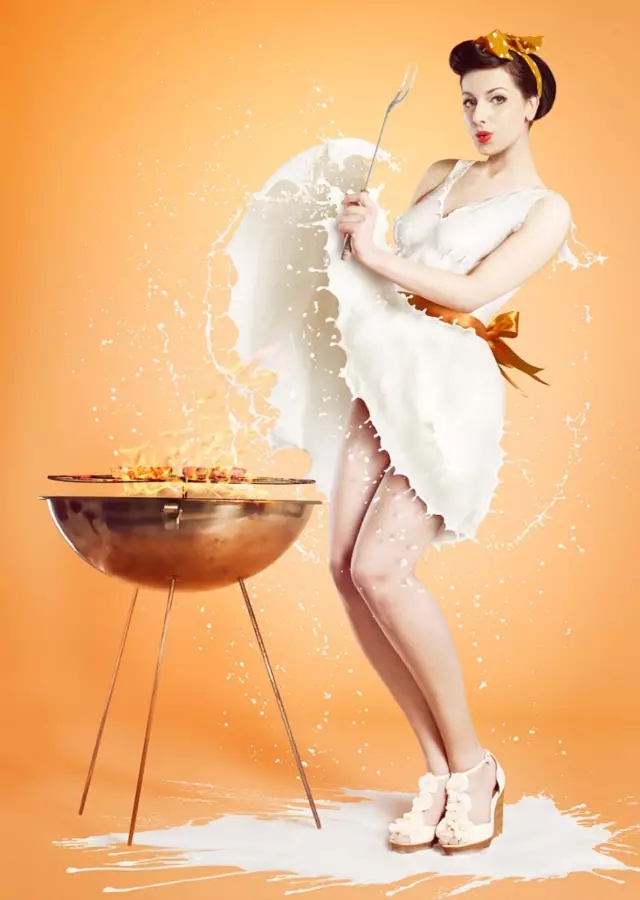 照片中,模特們大多被裝扮成上世紀(jì)“畫報女郎”的外形,牛奶順著她們的身體淌下,形成了一件件各具特色的美麗長裙。