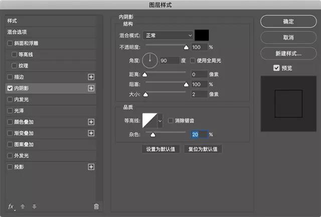 將智能對象圖層的填充不透明度設置為0,添加一個內陰影樣式設置如下。還要創建一個投影,只有1px的大小。這兩個陰影一起形成具有粗糙邊緣的筆畫/輪廓效果。