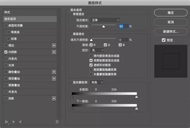 調整同一圖層的圖層樣式,在混合選項中將不透明度更改為50%,并禁用投影效果。