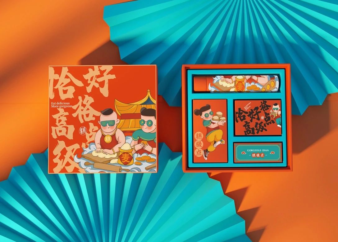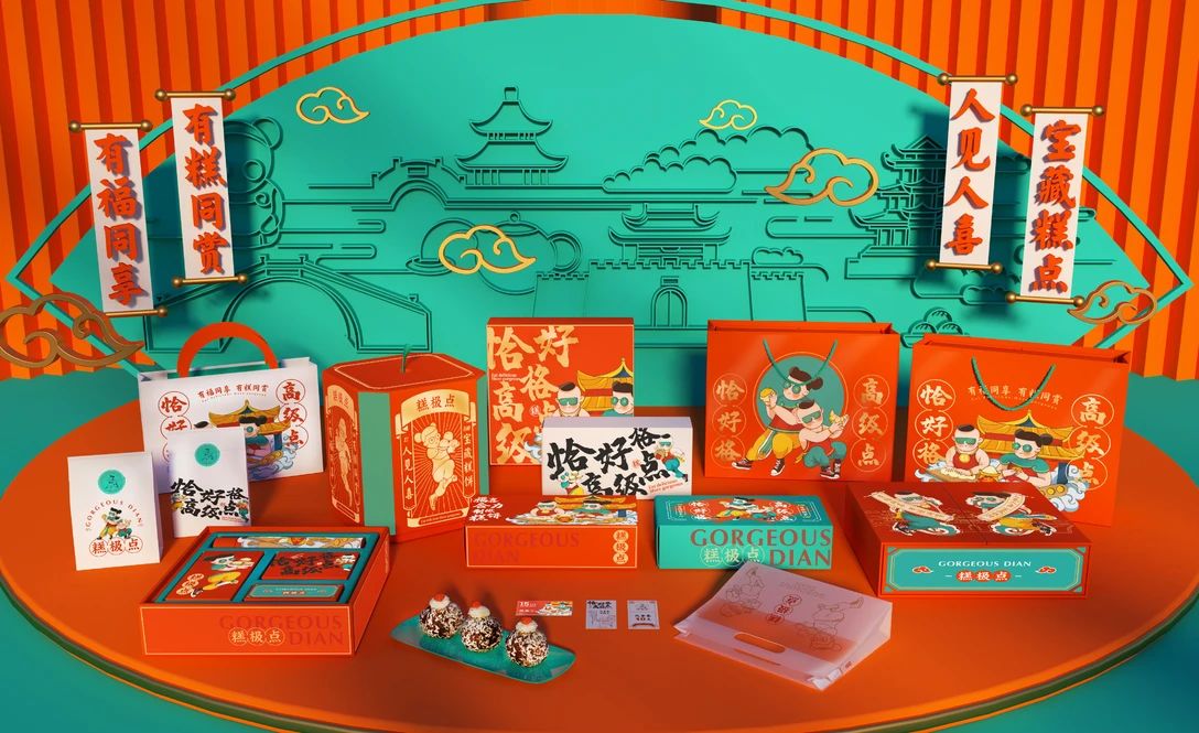從這個食品包裝設計可以發(fā)現(xiàn)在糕極點是走的國潮糕點的路線,突出有潮范的東方腔調(diào),用年輕人喜歡的方式展示出來。設計的理念也很是不錯:清明橋上曲悠悠,潑茶蒸餅俏眉頭,并把潮流來混搭,滿屋老小見歡喜。勾勒出了一個新潮又復古的東方世界。摒棄糕點固化的傳統(tǒng)模式,不斷強化無錫本土品牌概念,以大阿福作為本土形象代言。阿福福德德,阿喜客氣頭。本土潮仔,由無錫泥人演變而來,寓意送福送喜、祥瑞云集。把墨鏡、運動鞋等時尚元素加入其中,實現(xiàn)糕點與新國潮IP的跨界聯(lián)合。品牌主色調(diào)為愛馬仕橙與綠,色彩之間碰撞和對比,呈現(xiàn)出強烈的視覺沖擊力。表達出品牌內(nèi)核的力量,年輕張揚,自由無懼,充滿無限可能。