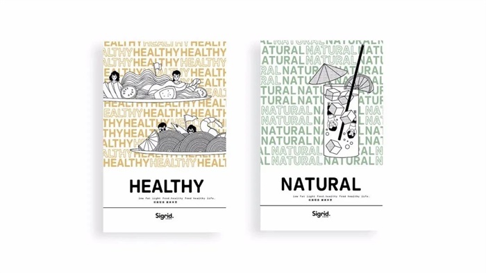 西格輕食以加粗的品牌名作為LOGO,更契合輕食“輕”的主題。整體風(fēng)格簡單清新明快,配色上采用了大量簡筆線條和留白,配上許些低飽和度的顏色,更易于突顯食材的艷麗,為店鋪帶來了爽朗活潑的氛圍。