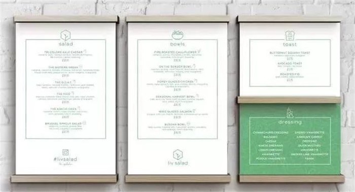 輕食不僅注重食物原本的味覺,并且將心化的概念作為主要的核心。與追求佐料帶來的味覺爽快不同的是,輕食以健康、養(yǎng)生、內(nèi)化作為新的飲食方式。目前來說,大部分輕食餐飲店為了突出輕食健康便捷的特點,都會在VI和空間上采用簡約圖形、低飽和配色和大部分留白來突顯其輕食屬性,這樣的視覺設(shè)計在讓食客感到輕松愉悅的同時,更能突顯出輕食艷麗誘人的色彩,為盤中營養(yǎng)但卻可能過于寡淡的美食增添許些“風(fēng)味”。