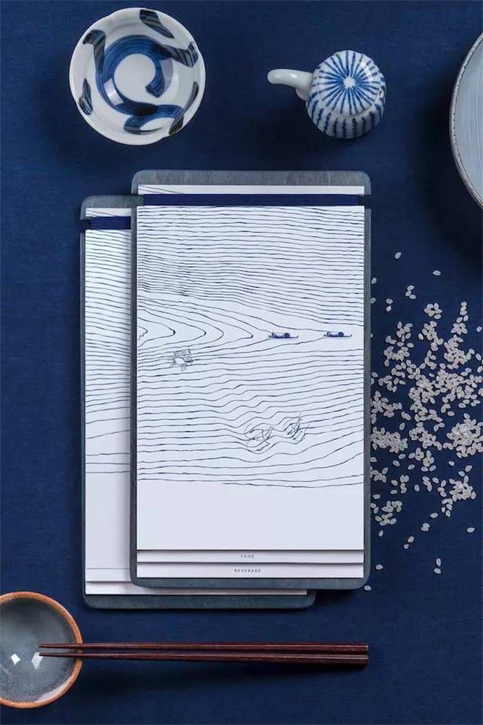 說起日式風,肯定少不了日料店。這家日料餐廳,以日本傳統花紋樣式青海波為品牌主要視覺元素,通過靛藍色和白色混搭的青海波圖案,呈現出自由開放的樣貌。簡約流動的線條,與插圖結合,頗有意趣。不僅將日本民間文藝元素進行圖形化展示,也是餐廳提供新鮮食材的一種比喻性表現。餐廳的LOGO以一個簡化的圓形米飯碗樣式進行呈現,圖形居中,文字進行環繞,簡約中又有立體突出的效果。