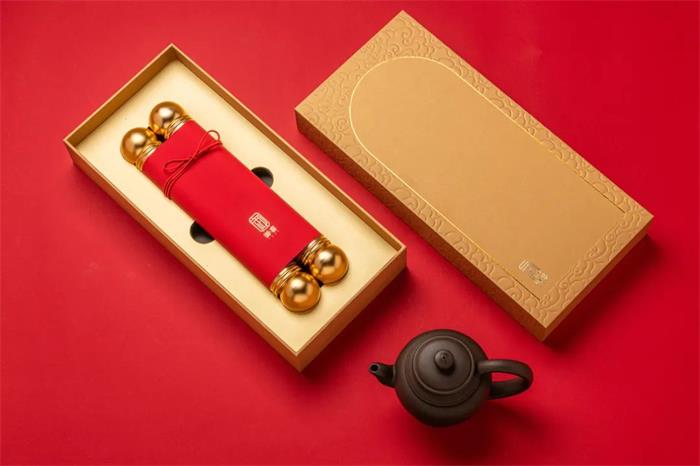 這款御喜茶以國潮風為主視覺,靈感來源于帝王所用物--“御”的敬稱以及圣旨的外觀概念,旨在從深厚的文化底蘊中挖掘經典元素,因而紅色包裝的圣旨外觀完成了茶葉的全新形象,另外同色的紅細帶,固定“圣旨”的同時兼顧了美觀性。有意思的是兩端的金屬鏤空軸柄設計,軸端處可扭開半圓,實現擴容的作用,進而能夠合理利用空間。展開后的“圣旨”畫面描繪了宮廷歲月靜好的情景,底襯賦以《奉茶》詩文,拉近與消費者的距離。金色外盒則以線條勾勒了宏偉的宮門形象,兩側繪以祥云深壓紋,一繁一簡,強化視覺張力。