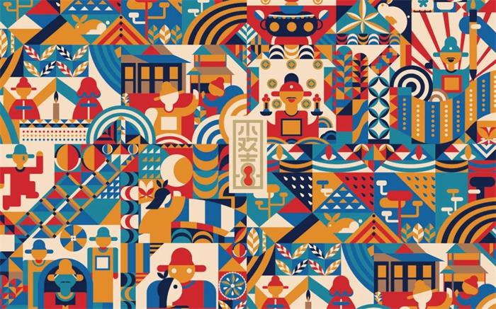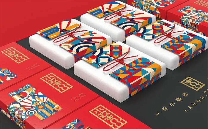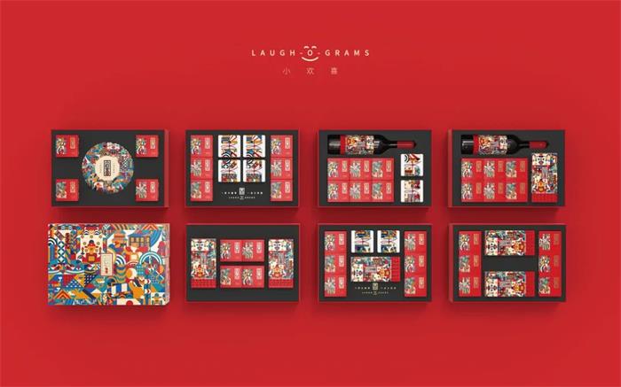 這款組合型茶葉禮盒套裝首先從產品使用情景推出文化再形成產品,并從產品本身出發,以中國喜文化為基礎依據形成“小歡喜”概念,賦予產品包裝一定的主題意義,不同于以往的插畫設計。這款禮盒以簡單的幾何圖形拼接而成,錯落有序的排列方式搭配高飽和度的斑斕色彩,營造了一種同慶歡喜的氛圍。而拼接成的畫面,呈現出“小歡喜”的拼音首字母形式,并在字母中加入了金榜題名、洞房花燭夜等人生之“八喜”的經典場景,扁平化的描繪手法反而增添畫面的立體感。內盒的獨立茶葉包裝則要更顯簡約,紅色外盒搭配半邊插畫內容,側標的“小歡喜”字樣經過藝術化處理,既能有效展現產品信息,也很好地平衡了整體視覺效果。白色盒裝則以可拆卸標簽貼為主視覺,紅色繩結的固定及裝飾作用豐富了整體包裝層次,進一步增強與消費者間的情感連接。