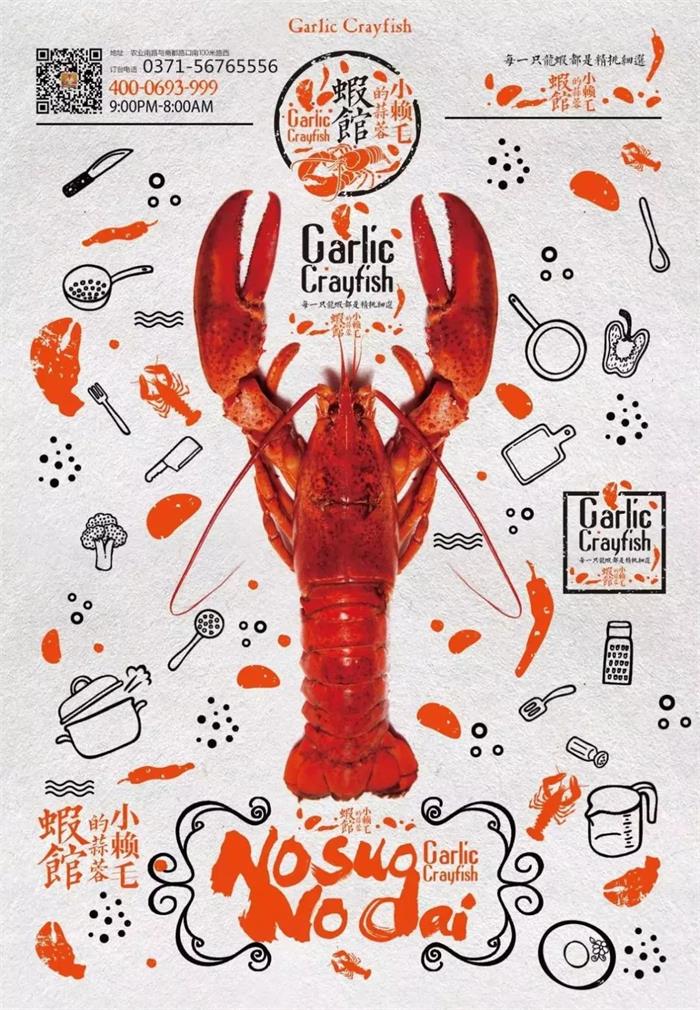 小賴毛的蒜蓉蝦館采用濃厚的色彩來,表現(xiàn)海鮮的鮮與兇猛,大膽的紅白黑撞色能從感官上刺激食欲,手繪圖案搭配兇猛小龍蝦,手繪風(fēng)與寫實風(fēng)的碰撞帶來強(qiáng)烈的視覺效果。以眾多細(xì)小的廚房用品為輔助圖形,細(xì)節(jié)感與層次感up up up,涂鴉風(fēng)格的應(yīng)用很年輕時尚。