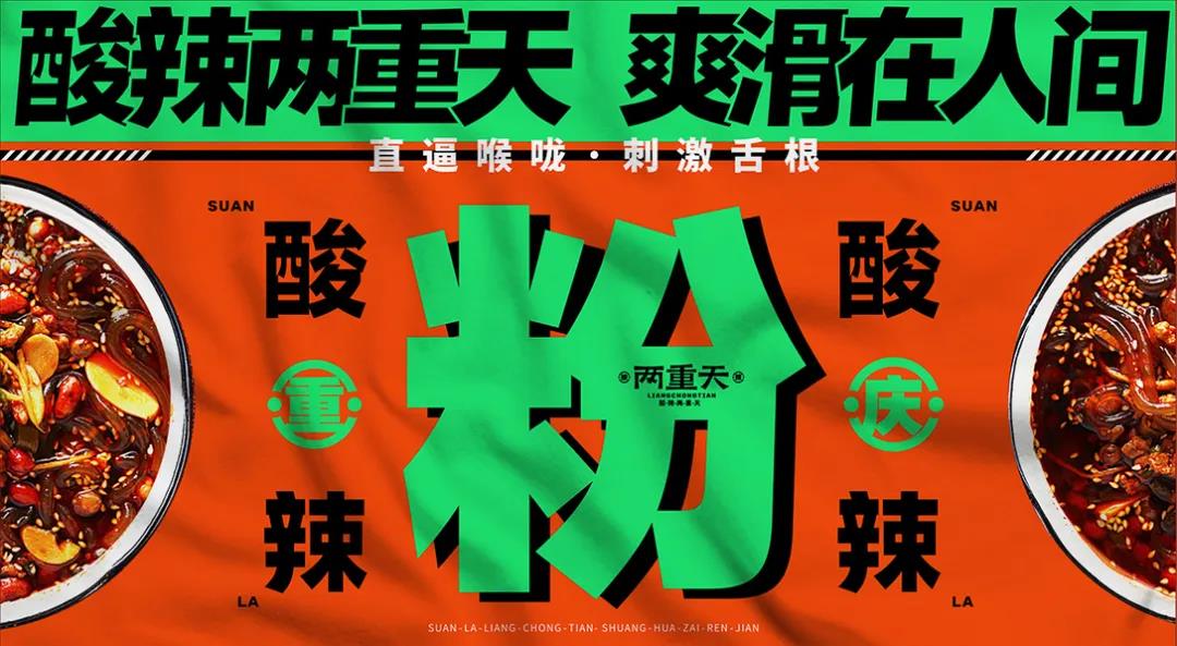 這個(gè)酸辣粉的品牌LOGO,是簡(jiǎn)潔的幾個(gè)字體組成,用排版順序的重次增加視覺效果。而Slogan“酸辣兩重天,爽滑在人間”,表層字眼的文案,有著“簡(jiǎn)單粗暴”的勁爽。