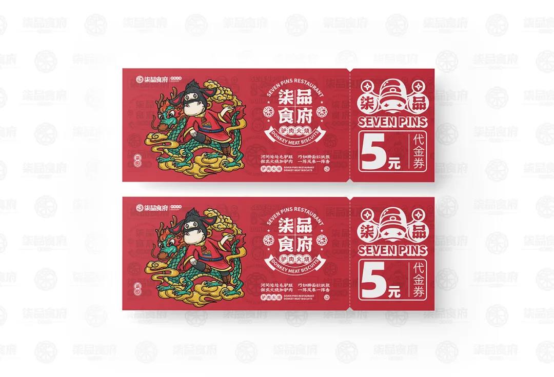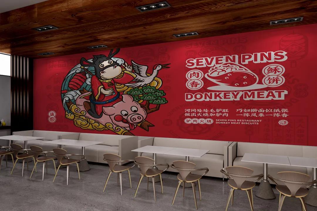 品牌根據(jù)品類塑造了一個(gè)驢IP,擬人化處理后的驢IP,形態(tài)更接近Q版,兩只驢耳朵向外伸展,隨著表情動(dòng)作向上或向下伸展,很是靈動(dòng)。傳統(tǒng)服飾在身,對(duì)驢肉火燒的歷史悠久進(jìn)行不經(jīng)意的刻畫。驢IP拿著不同的東西做出不同的動(dòng)作時(shí),形象就變得年輕起來(lái)了,十分有趣。驢IP與青龍、鯉魚、嫩豬以及小雞等具有中式代表性的動(dòng)物進(jìn)行搭配,創(chuàng)作出一幅幅國(guó)潮風(fēng)插畫,是對(duì)美好寓意的向往和憧憬,也突出品牌的包容性和多樣性特點(diǎn)。品牌的輔助圖形就比較常見了,從標(biāo)志和IP中延展,與文案和簡(jiǎn)筆食材、菜品結(jié)合,以此更好的宣傳柒品食府這個(gè)品牌。