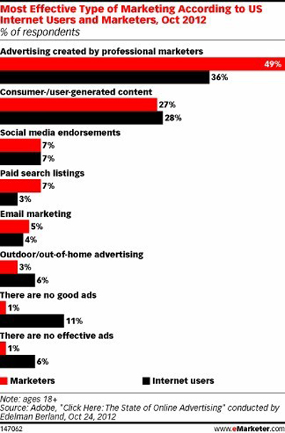 營銷人員和消費者在多種廣告形式的效果上存在著不小的差異。盡管雙方一致認為好廣告是由專業營銷機構所創作。在付費搜索廣告、戶外廣告、郵件廣告以及對好廣告、有效廣告的判斷方面,雙方的差異尤其明顯。