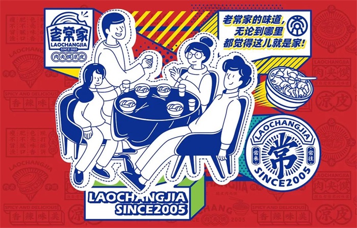 老常家肉夾饃,緣起于地道陜西美食,幾十年來堅持手工打饃,精選優(yōu)質(zhì)上等好豬肉每日小伙慢燉,饃焦香酥脆,肉肥而不膩,瘦而不柴。此次品牌設(shè)計是對老常家品牌的15年經(jīng)營的一個提升。LOGO的形狀是一塊出爐打包好的肉夾饃,饃被咬了一個小口,包裝紙平面里置放著老常家三字,字體線條下意識往下垂凹,使其與其他字體樣式區(qū)別開來,品類標(biāo)識用多個圓圈圈起來,對應(yīng)上肉夾饃的形狀。輔助圖形利用標(biāo)志和品類結(jié)合幾何圖形來塑造,是當(dāng)下眾多餐飲品牌會使用的一種輔助圖形設(shè)計方式,意在更好的傳達品牌的優(yōu)勢和賣點。