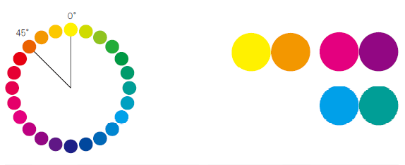 類似色配色方案由色相環(huán)中形成90°角內(nèi)的不同色相以一定順序顯示,在明度和飽和度上可呈逐層漸變的配色方案。