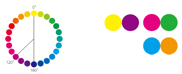 色環(huán)上色相間的夾角在120°到180°之間是強對比,這樣的對比看上去鮮明活潑且形成強烈的視覺沖擊,但如果處理不當(dāng)?shù)脑捒赡軙䦷硪曈X疲勞、不安全感和不協(xié)調(diào)感。