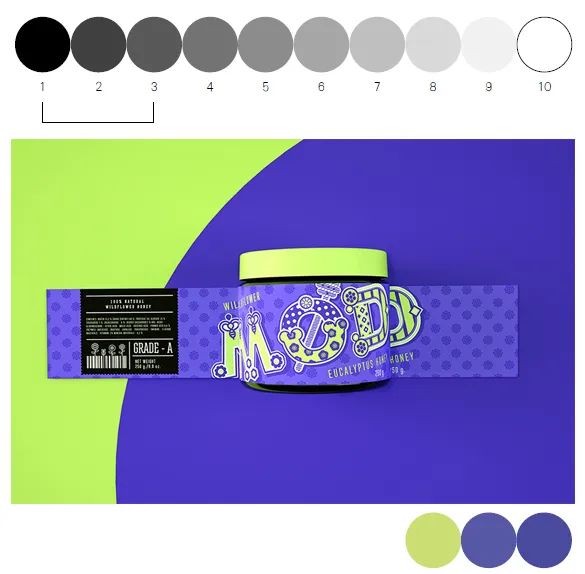 4~6個色階間的飽和度差的顏色對比是飽和度中對比。這種對比傳遞含蓄、溫和的感覺,在這種對比下的形象會有更高的可視度,畫面看起來也更加有活力,因此,飽和度中對比在設(shè)計中很常見。