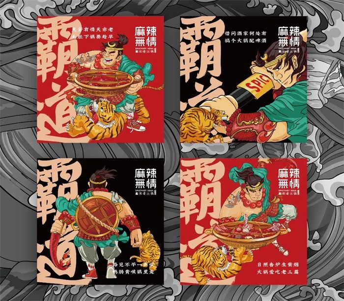 麻辣無情重慶老火鍋這家主打“麻辣火鍋”的餐廳,同樣以年輕群體為主,故用辣椒紅作為品牌的主色調以刺激消費者的食欲。采用繁字體進行設計的品牌標識,slogo“夠麻辣 才霸道”,以更強烈地確定品牌的調性和認知度,用“霸道”來詮釋重慶文化的江湖氣息。該品牌還針對重慶的江湖地域特性,和火鍋本身傳達的“熱鬧”“爽辣”屬性重新設計了“武松”這一江湖俠客形象,同時還設計了輔助圖形,包括重慶著名景點的元素等,以更有力的視覺符號提高品牌設計的識別性。