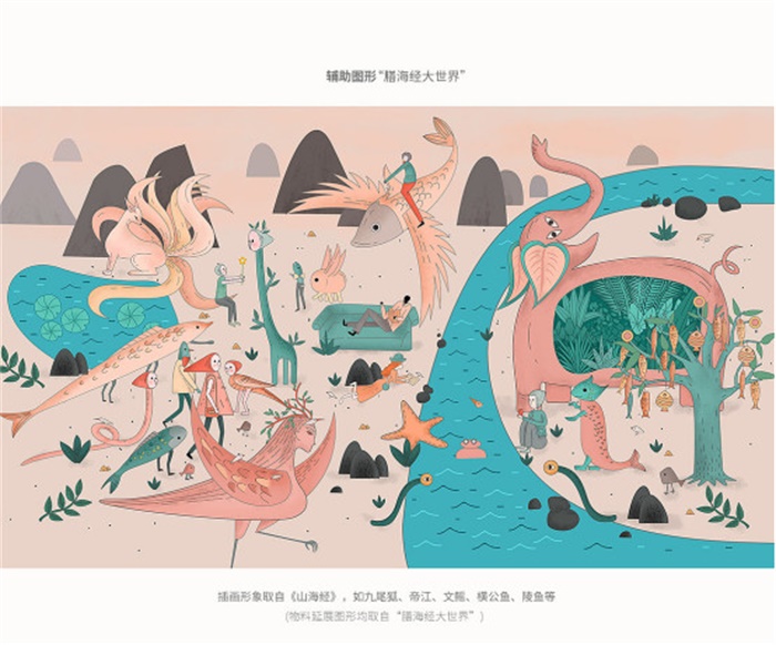 膳海經(jīng)VI設(shè)計(jì),該零食品牌面向年輕群體,為了迎合年輕人的喜好,采用插畫(huà)的設(shè)計(jì)形式進(jìn)行包裝設(shè)計(jì)。“膳海經(jīng)大世界”是借助山海經(jīng)的形象進(jìn)行創(chuàng)作,想要展示一個(gè)不受世俗約束的樂(lè)園,同時(shí),顯現(xiàn)出膳海經(jīng)食材豐富,山珍海味無(wú)奇不有。標(biāo)志整體形態(tài)由圖文組成,圖的形態(tài)由輔助圖形中的動(dòng)物與植物圖形組成,展現(xiàn)一副生機(jī)勃勃的景象,強(qiáng)調(diào)品牌是原生態(tài)、純天然的綠色食品。文字由品牌名“膳海經(jīng)”組成,線條簡(jiǎn)約,兼具現(xiàn)代時(shí)尚感和中國(guó)風(fēng)韻。傳遞品牌立足現(xiàn)代,傳承傳統(tǒng)文化的品牌宗旨。