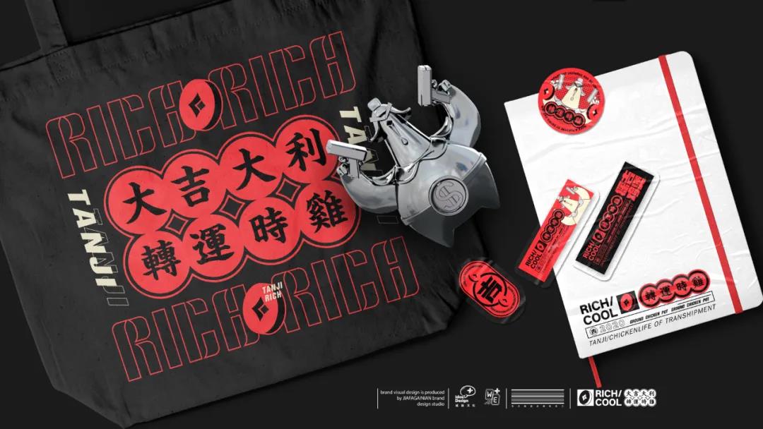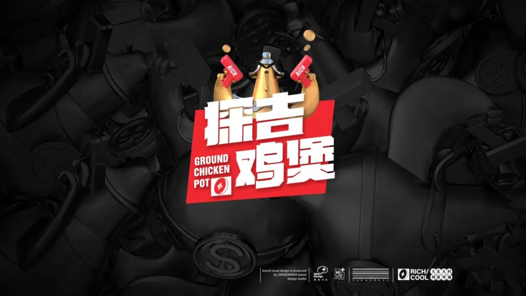 品牌的LOGO圖案是一只帶著盔帽、雙翅拿著手槍的金色立體雞形象,探出方形的紅色底色,探吉雞煲四字兩兩上下分布,字體線條粗大寬扁,頗有種財(cái)大氣粗的感覺(jué),小銅錢(qián)在左下角與英文組合,使LOGO的呈現(xiàn)形態(tài)更加統(tǒng)一完整。因?yàn)榕c吉利、財(cái)神等掛鉤,所以品牌在用色上選取了財(cái)神紅,搭配銅錢(qián)質(zhì)感的金屬灰杏色,黑色用于強(qiáng)調(diào)氛圍感。