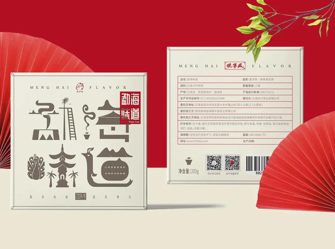 這款勐海味道茶葉包裝,整體以米色調(diào)進(jìn)行畫(huà)面鋪設(shè),封面的字體設(shè)計(jì),巧妙融入了當(dāng)?shù)氐慕ㄖ⒖兹浮釒е参锏龋癸@茶品名稱的同時(shí),使得畫(huà)面表達(dá)更具美感。