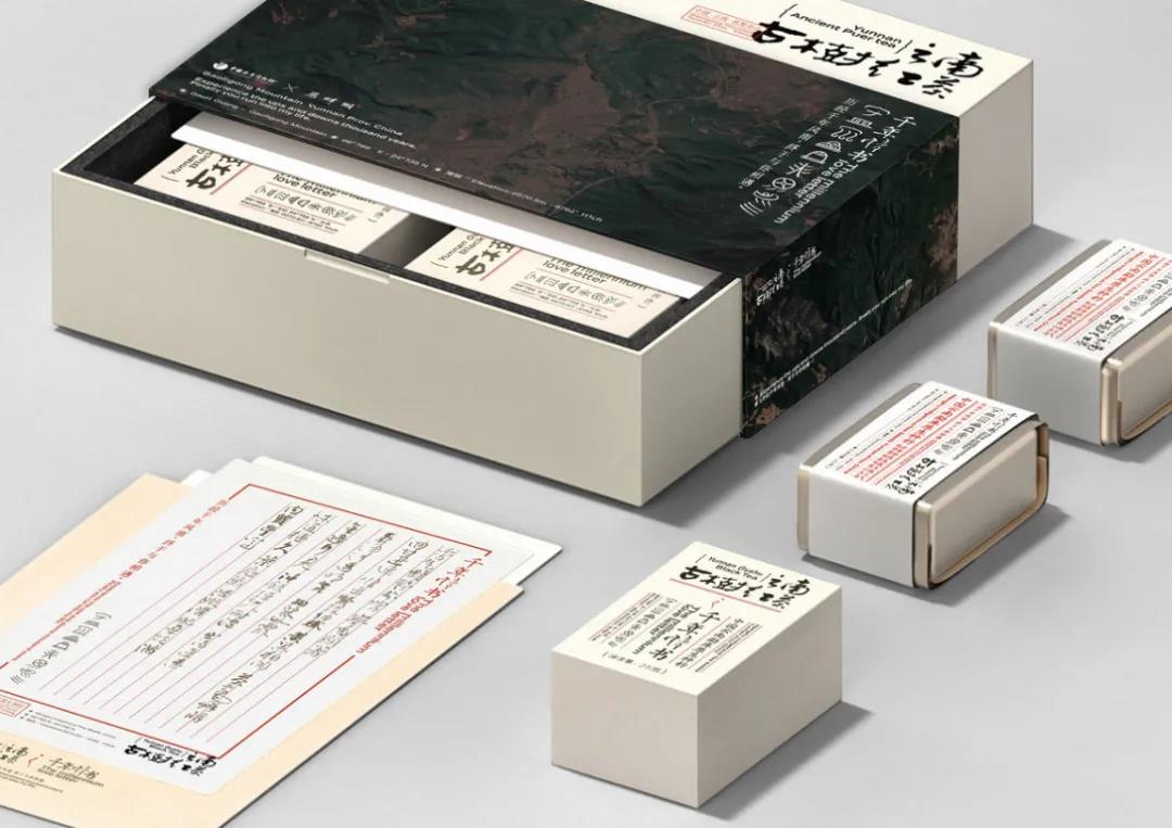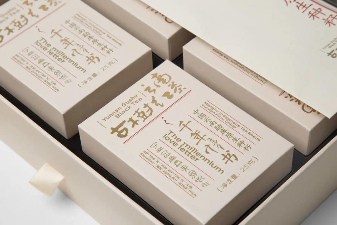 先來(lái)看有點(diǎn)浪漫的手工情書(shū)系列,原木色的禮盒包裝,奠定了整體歲月靜好般的小資情懷,輔以沉黑色的山景圖腹帶標(biāo)簽貼,很好地平衡了視覺(jué)層次。另外封面還設(shè)有古老的漢字書(shū)體,重點(diǎn)突出茶葉的產(chǎn)地等信息,呼應(yīng)了品牌的“手工情書(shū)”系列,增強(qiáng)整體的文化底蘊(yùn)。